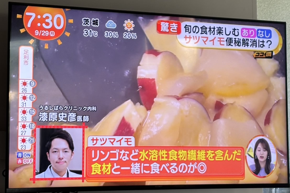 テレビでも紹介されていたサツマイモとリンゴとの煮物以外にも、もち麦入りのさつまいもご飯や、さつまいもと大根・わかめの味噌汁といった水溶性食物繊維と不溶性食物繊維をバランスよく摂取することが大切です。