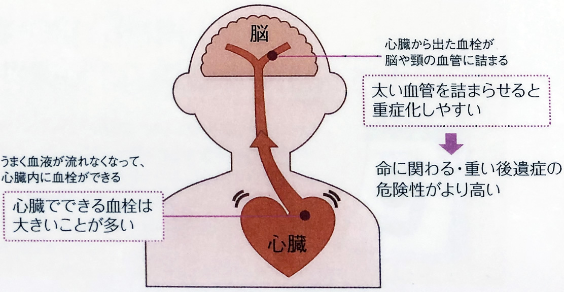 心臓で作られた血栓は大きいことが多く、太い血管を詰まらせるので、命に関わったり、重い後遺症が残る危険性がとても高くなっています。