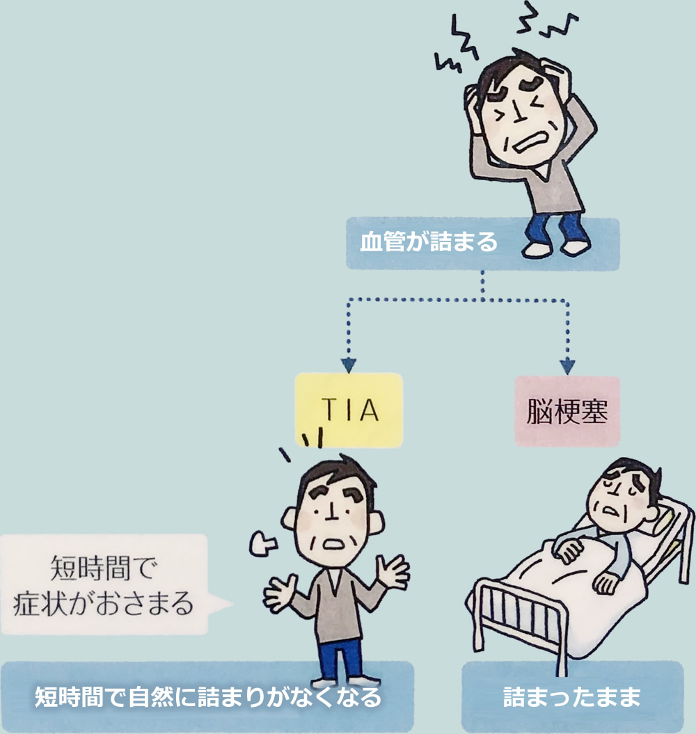 「TIA」とは、一過性虚血発作の略で、一時的に脳梗塞と同じように脳の血管が詰まって脳梗塞と同じ症状があらわれるのですが、短時間のうちに血の流れが回復し、症状が消えるという病気です。