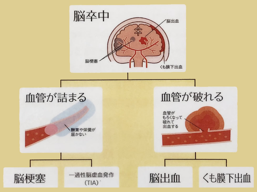 「脳卒中」は、脳の血管にトラブルが起きて、酸素や栄養を運ぶ血液が脳に行き届かなくなったり、出血を起こしたりして脳組織がダメージを受ける病気の総称です。